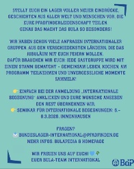 Ein Seminar für Internationale Begegnungen wird vom 6.3.2026 bis 8.3.2026 in Immenhausen stattfinden. Dort könnt ihr euch mit anderen BdP Stämmen austauschen, letzte Fragen klären und erhaltet alle Informationen über die finanzielle Förderung einer internationalen Begegnung. Um diese Fördermittel zu beantragen, könnt ihr einfach Diana aus dem Bundesamt eine kurze E-Mail schreiben: diana.schlundt@pfadfinden.de